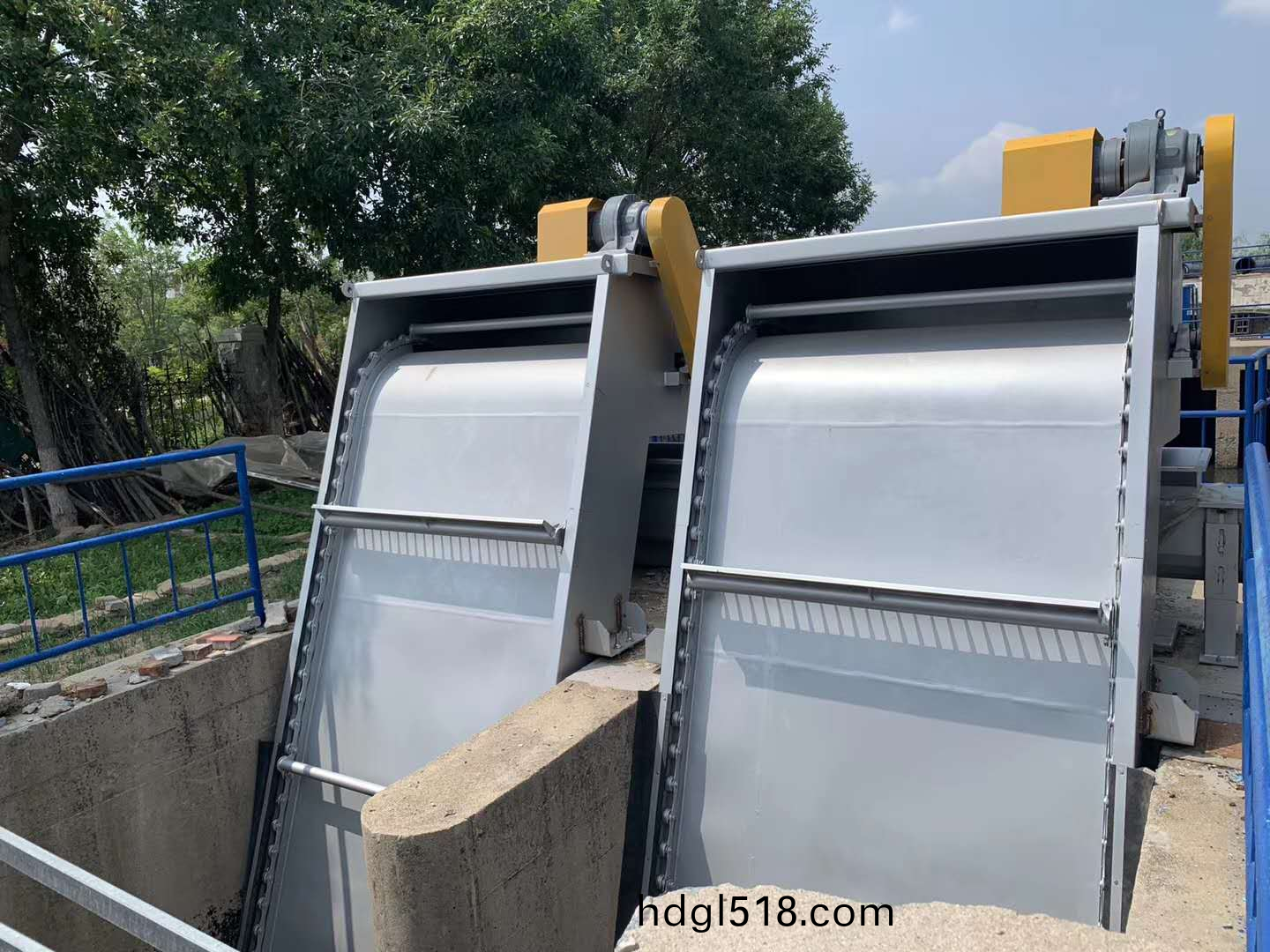 通(tong)過鏈(lian)帶動(dong)的(de)若榦(gan)組齒耙挿入靜止的(de)柵(shan)條,將(jiang)汚物與水分離(li)的格柵(shan)除(chu)汚機(ji),代號爲GL。